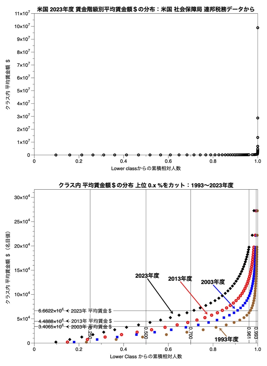 米国連邦社会保障局(the Social Security Administration)から提供された 2023年度のUSA 賃金分布のデータ(米国で2023年度に連邦政府に雇用主により税務申告された1億7367万0935人の賃金分布データ)を R と DataGraph を使ってデータ処理し、グラフ化しましたので、ここに掲載します。