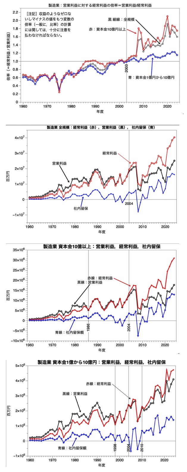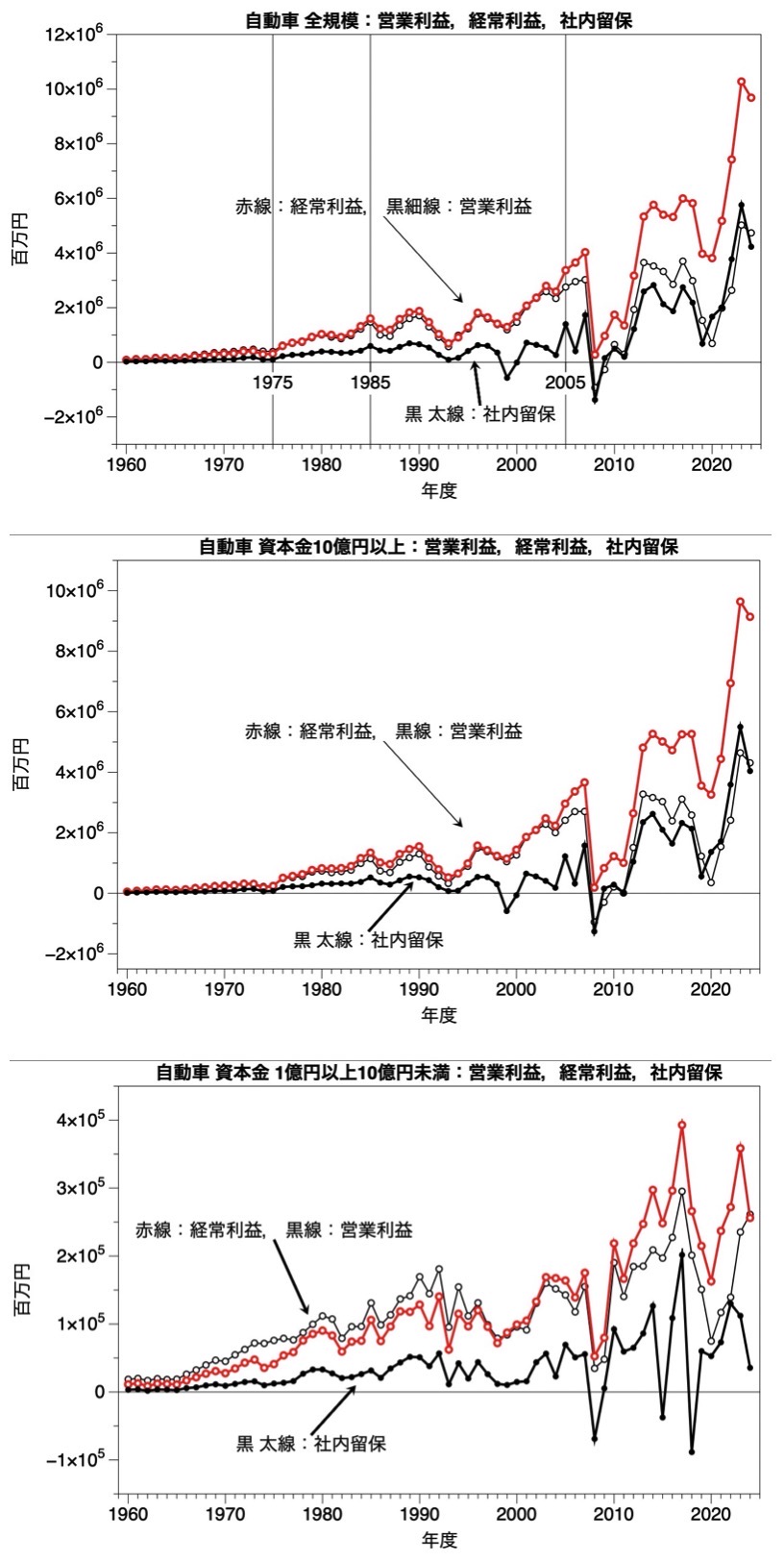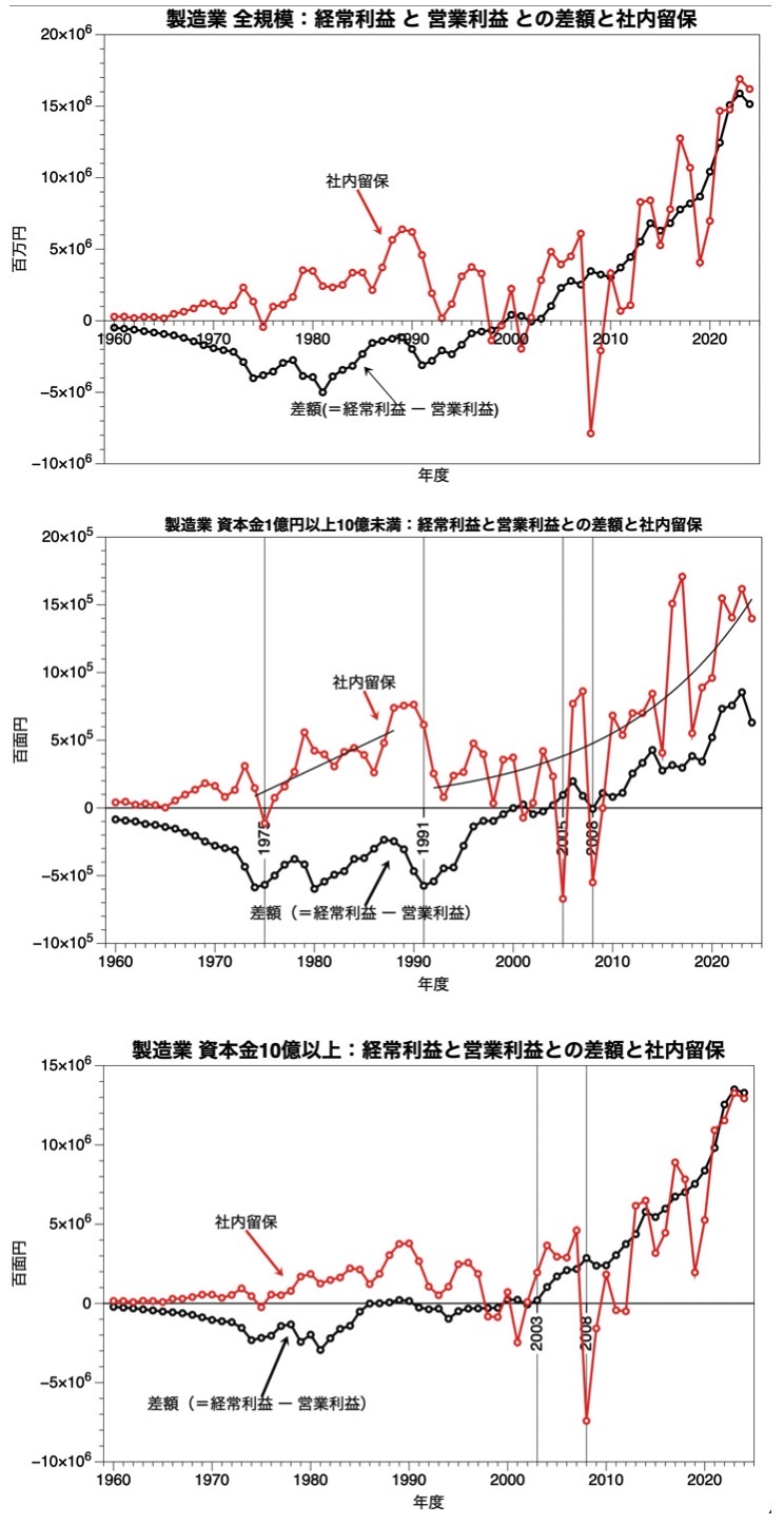 法人企業統計調査は比較的に安心して利用できる統計調査の一つである。ここでは,製造業(全体,自動車関連,食料品生産関連;及び 資本規模別)の 営業利益,経常利益,社内留保の関連を1960年度から2024年度までの長期時系列データを視覚化(統計グラフ化)することで,資本主義の形態変容を確認する作業を行う。