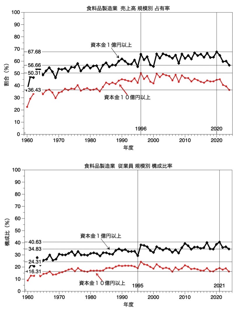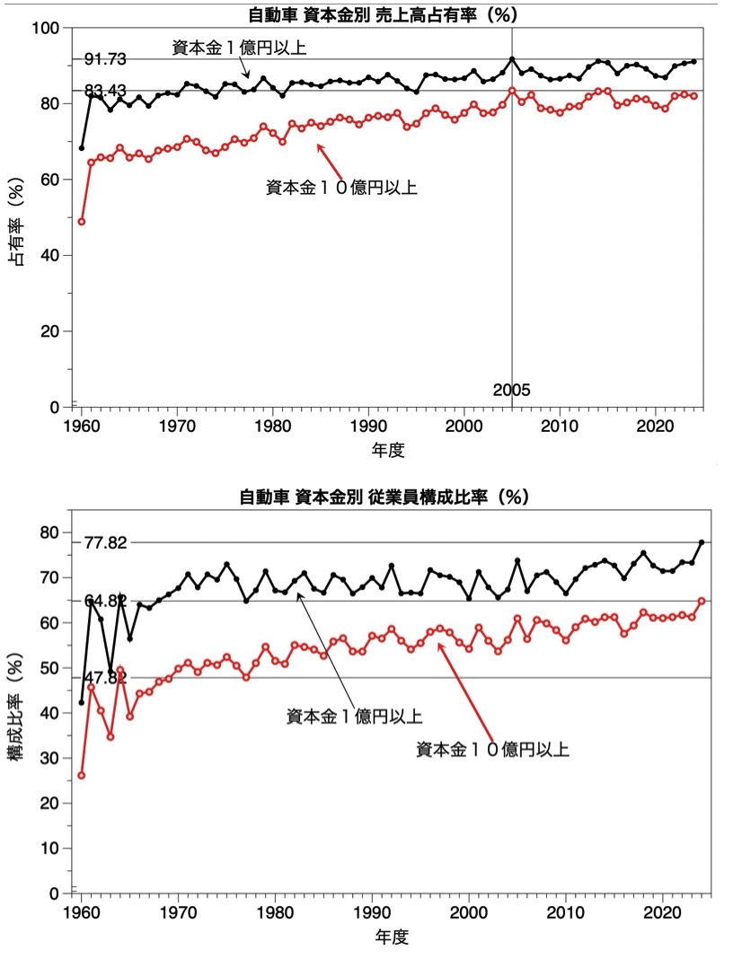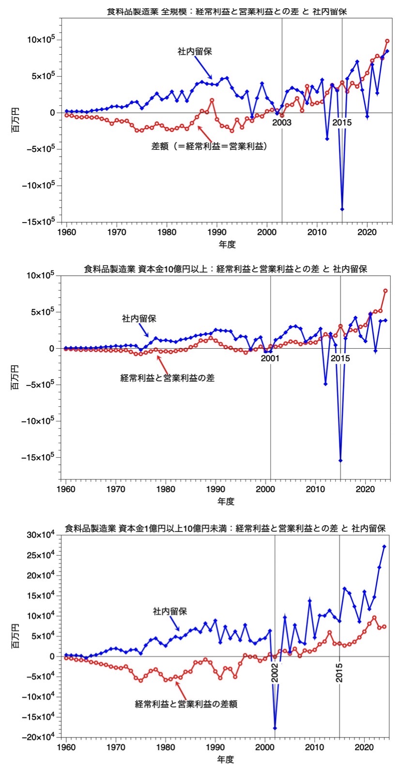 法人企業統計調査は比較的に安心して利用できる統計調査の一つである。ここでは,製造業(全体,自動車関連,食料品生産関連;及び 資本規模別)の 営業利益,経常利益,社内留保の関連を1960年度から2024年度までの長期時系列データを視覚化(統計グラフ化)することで,資本主義の形態変容を確認する作業を行う。